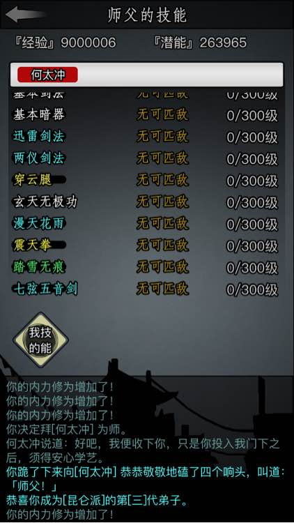 基础武学修炼是另一种提升后天属性的方法。每提升10级基本拳脚能加1点后天臂力,基本轻功加1点后天身法,基本内功加1点后天根骨,读书识字加1点后天悟性。后天属性的效果是先天属性的一半,比如100后天臂力等于50先天臂力。所以前期多练基础武学,能有效弥补先天属性的不足。尤其是想进某些门槛高的门派,比如古墓派对颜值有要求,少林对根骨有要求,提前练好相关基础武学就能轻松达标。